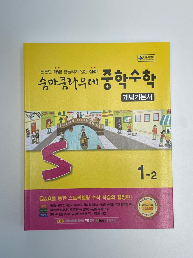 두 번째로는 "중학교 수학" 교재를 추천해요. 이 책은 2025년 교육과정에 맞춰 새롭게 개편된 교재로, 기본 개념을 확실히 다질 수 있도록 구성되어 있어요.